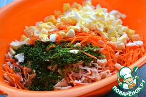 В подходящую емкость выложить овощи и крабовые палочки, добавить рубленые отварные яйца и измельченный укроп. Заправить салат смесью майонеза и сметаны (или майонезом/сметаной в чистом виде). Перемешать, попробовать на соль.