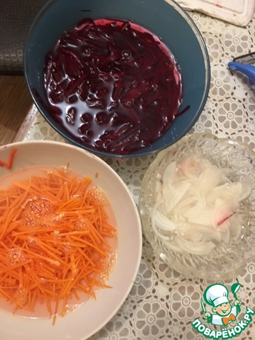 Заливаем каждый овощ водой и добавляем уксус, маринуем минут 20.