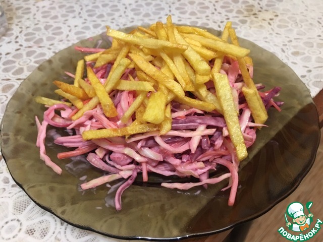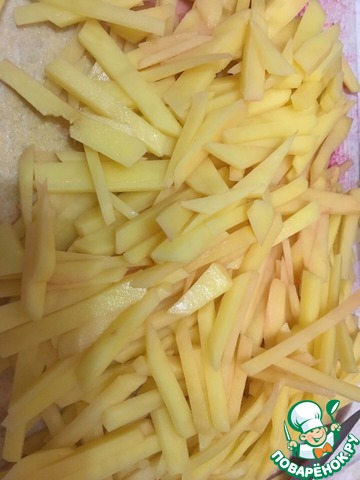 И режем картошку, тонкой соломкой, картофель обжарить во фритюре, до золотистой корочки. Мясо так же нарезать и обжарить.