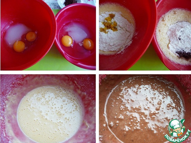 во вторую миску добавить 50г муки, смешанную с разрыхлителем теста (темное тесто), какао-порошок.