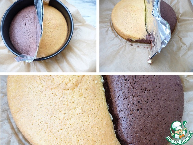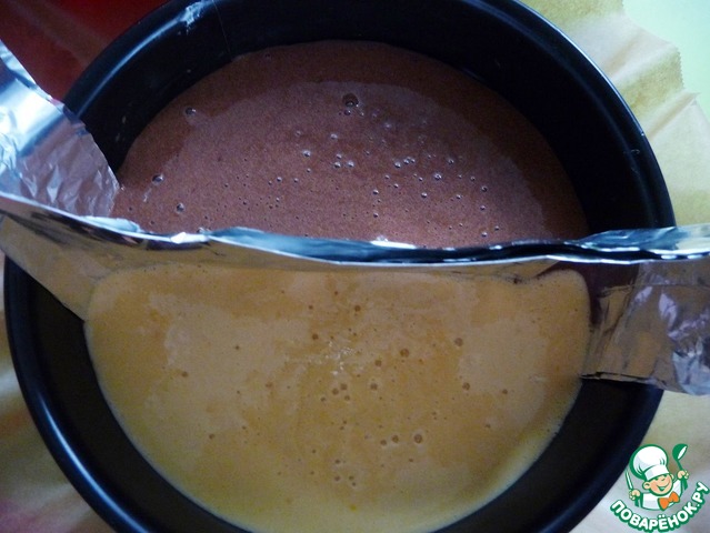 • Выливать тесто двух видов в форму одновременно, не сбивая перегородку.