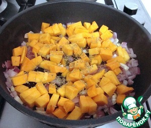 Добавить тыкву с розмарином и обжаривать не до готовности минут 5.