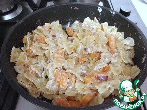 И так как паста еще какое-то время проведет в сковороде, то ее лучше варить на пару минут меньше, а в сковороде дойдет.