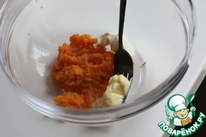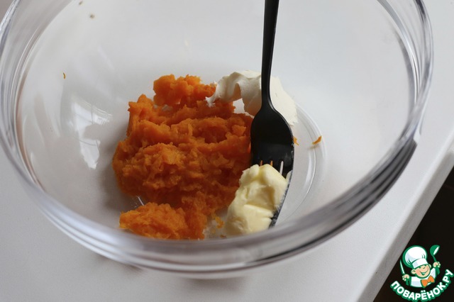 Слить воду с тыквы. Затем размять её вилкой, постепенно добавляя сливочное масло и сметану.