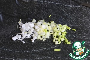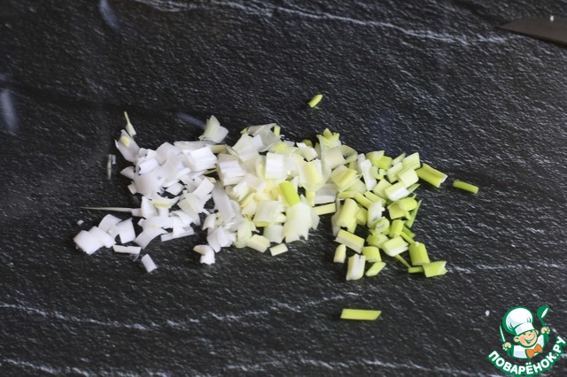Зелёный лук мелко нарезать. Не много зелёных перьев оставьте для подачи.