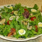 Выложить салат горочкой на блюдо, застеленное листьями зеленого салата.