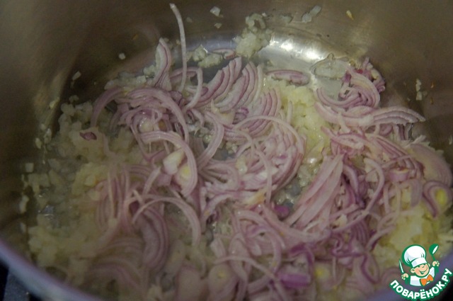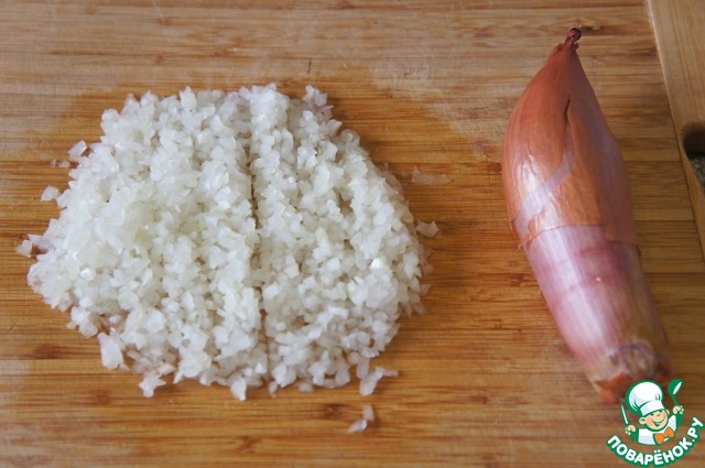 Лук нарезать на кубики и обжарить. Я не смогла купить лук-порей, как назло в магазине не оказалось, поэтому заменила на лук-шалот. Они чем-то немного похожи.