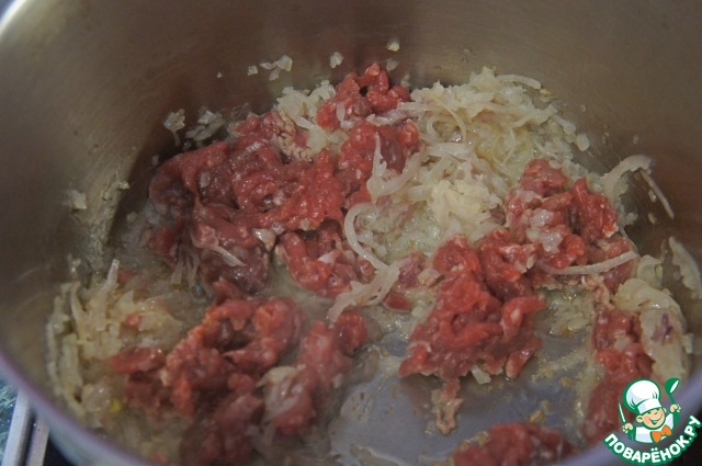 Добавить фарш и обжарить все вместе до готовности фарша.