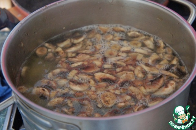Нагреть воду в кастрюле до кипения. Добавить обжаренный лук, фарш и грибы. Варить минут 5.