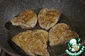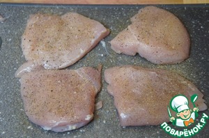 Каждое филе разрезать на две части, накрыть целлофановым пакетом и слегка отбить. Особенно толстые части. Посолить и поперчить. Можно посыпать приправой для курицы.