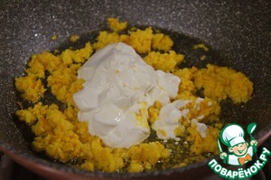 Добавить сметану и все вместе еще обжарить в течение нескольких минут.