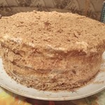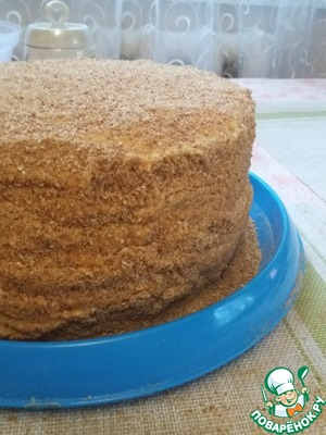 Через несколько часов обмазываем торт оставшимся кремом и обсыпаем крошкой (крошку делаем из обрезков)