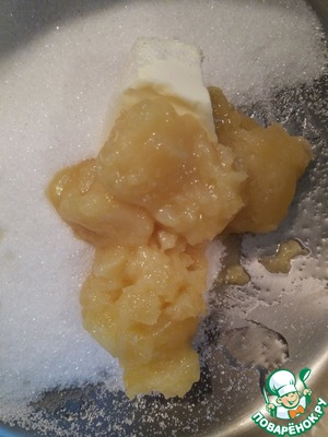 В кастрюлю с толстым дном кладем сахар, масло, мед и воду