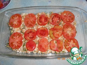 Морковь с репчатым луком обжариваем в сковороде с растительным маслом до золотистого цвета. Смешиваем все ингредиенты, кроме помидор и кабачков.