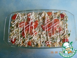 Опять слой кабачков, оставшийся фарш, слой помидор, украшаем сеткой из майонеза.