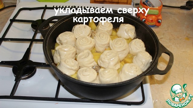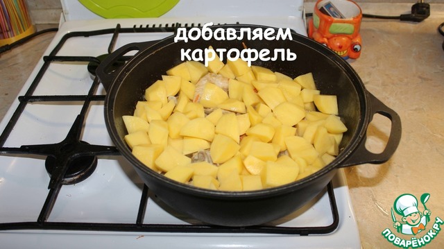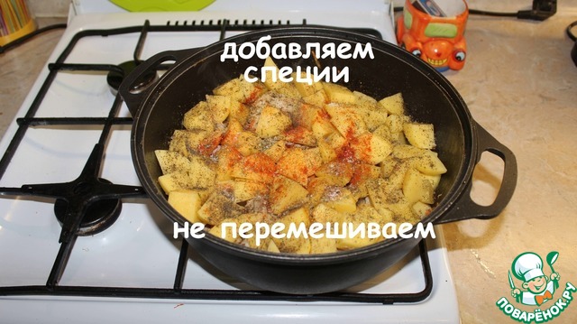 Укладываем сверху картофеля. Накрываем крышкой и тушим на медленном огне 40 минут.