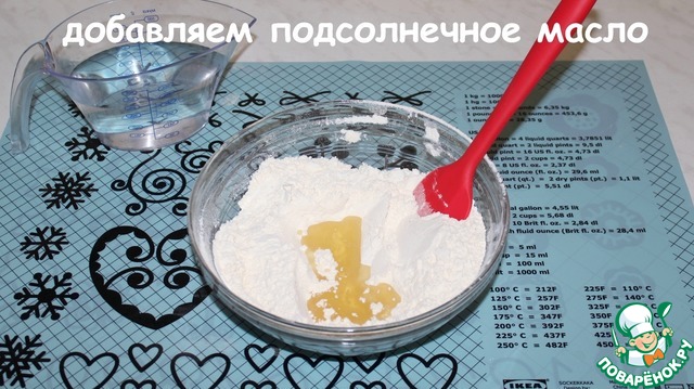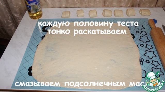 Каждую половину тесто тонко раскатываем. Смазываем подсолнечным маслом.