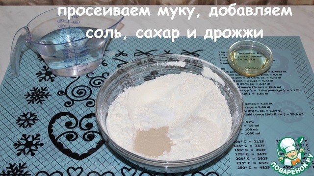 Готовим тесто. Просеиваем муку. Добавляем дрожжи, соль и сахар.