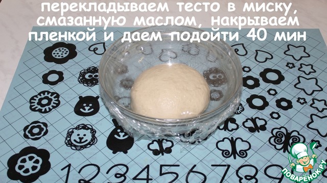 Перекладываем тесто в миску, смазанную маслом. Накрываем пищевой пленкой и даем подойти 40 минут.