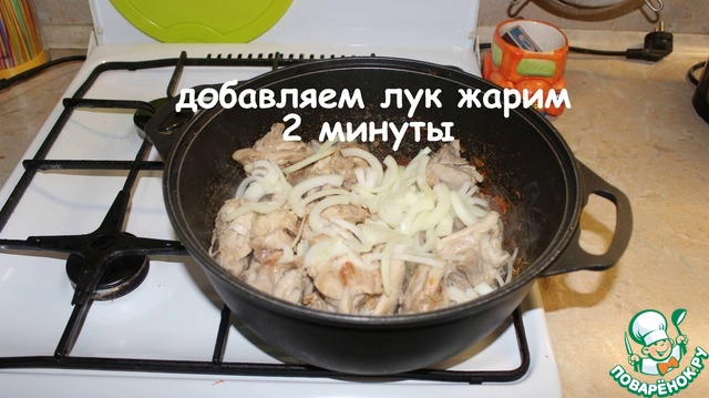 Добавляем лук, нарезанный полукольцами. Жарим 2 минуты.