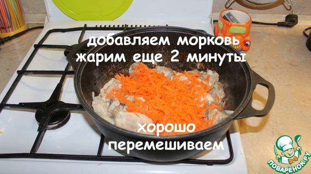 Добавляем морковь, натёртую на терке. Хорошо перемешиваем и жарим еще 2 минуты.