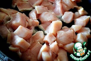 Нарезаем филе на кусочки, солим, перчим, обжариваем в раскаленном масле до полной прожарки и появления равномерной румяной корочки.