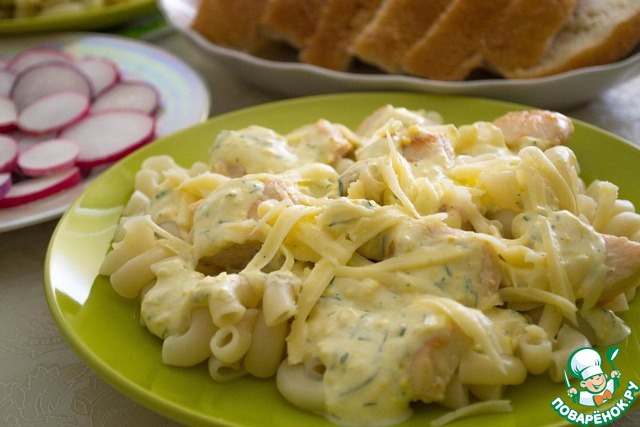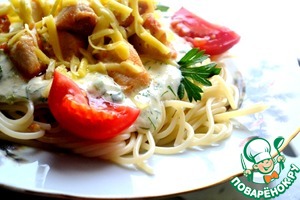 Подаем к столу спагетти, на них - куриное филе.