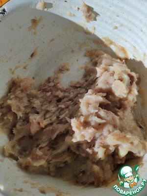 Половину сваренной фасоли перемолоть в блендере и добавить к фаршу и луковице. Все тщательно вымешать. -