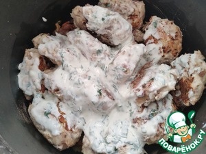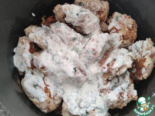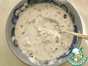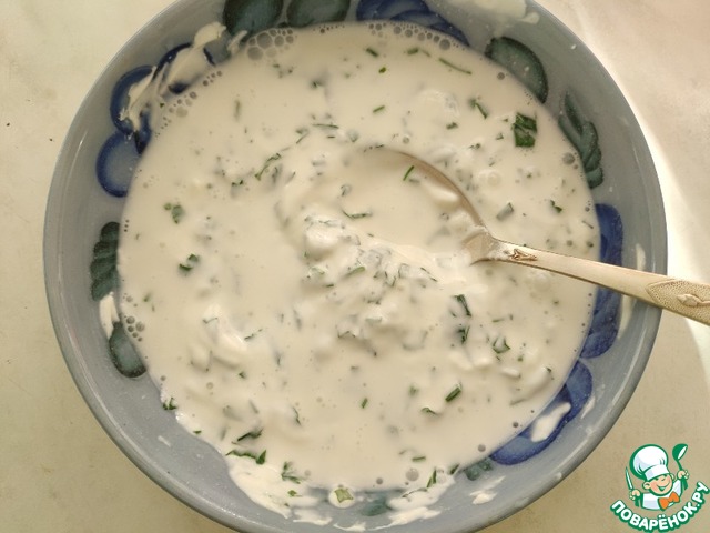 Подготовить соус:смешать сметану и зелень, добавить немного воды. -