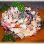 Мой муж в еде большой мудрёна. И угодить ему с салатом не легко. Но как-то в одном кулинарном журнале (уже не помню названия) нашла этот рецепт и немного его изменила- подогнала, так сказать, под вкус мужа. И, о чудо! Муж одобрил. И теперь ни одно застолье не обходится без этого салата.