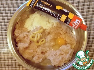 В фарс добавить манную крупу, яйцо, соль, перец и горчицу ТМ "HAAS" "Медовая". Перемешать.