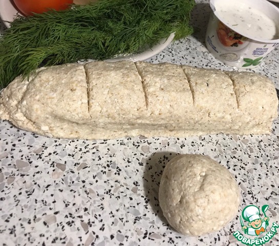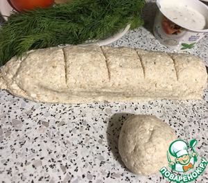 Плоскость стола промазать маслом растительным, смочить руки. Выложить тесто и скатать в жгут. Разрезать на шесть кусков. Каждый скатать в шар.