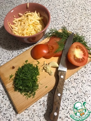 Зелень порубим, чеснок порежем очень мелко (или через ческонодавку). Помидор разрежем на слайсы и еще раз - на четвертинки. Сыр натрем на крупной терке. -