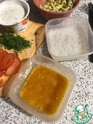 Достаем наши заготовки, смазываем йогуртом. В данном случае, я взяла готовую заправку от известного производителя. Но приготовит его можно самим - йогурт, оливки, паприка, базилик, соль, перец взбить в блендере - все, очень вкусно!