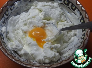 • Творог смешать с сахарной пудрой, ванильным сахаром, сметаной и желтком.
