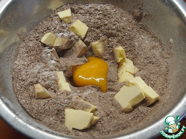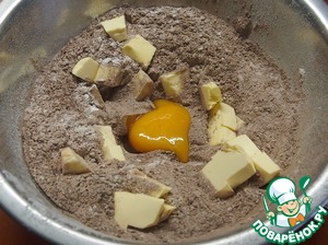• Добавить порезанное кусочками масло и яйцо, сделать пальцами крошку, если крошка суховатая, добавьте одну ложку воды или молока.