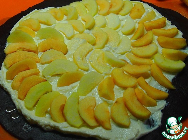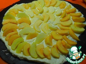 • Неровные края обрезать ножом, в середину выложить творожную начинку и распределить ее, оставляя незаполненными края, примерно 5-6 см. На творог разложить дольки яблок. Края таеста осторожно загнуть внутрь. Галету вместе с бумагой, на которой раскатывалось тесто перенести на противень.