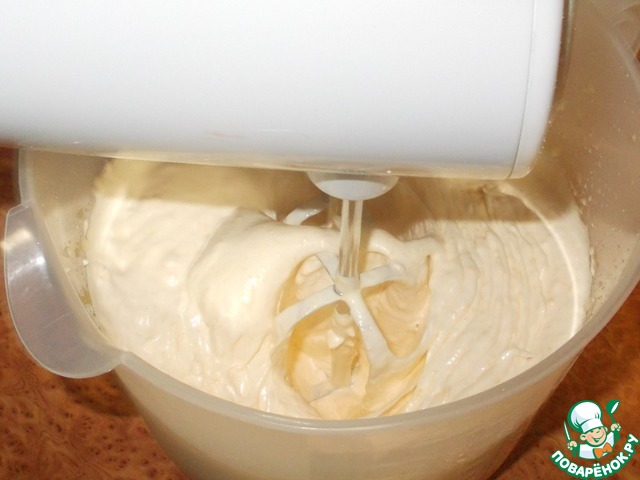 • Затем даем массе немного отдохнуть (около 5 минут). Всыпаем в суфле разрыхлитель и взбиваем еще 5 минут при полной мощности миксера. Масса заметно увеличилась в объеме, стала значительно светлее и постепенно заметен рельеф от работы венчика.
