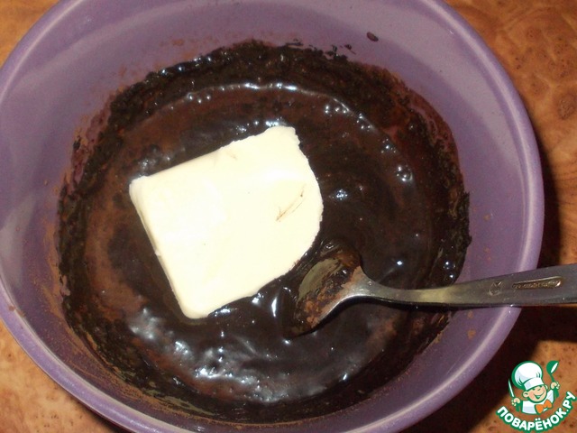 • Покрыв все пирожные кремом-суфле, ставим их в холодильник, а сами занимаемся приготовлением глазури. Для этого в пиале пригодной для СВЧ смешиваем какао, сахар и сок (у меня сок виноградный домашнего приготовления, но можно брать любой сок на свой вкус, можно вместо сока взять молоко или даже спиртной напиток для взрослого варианта десерта). Перемешиваем и кладем сверху сливочное масло.
