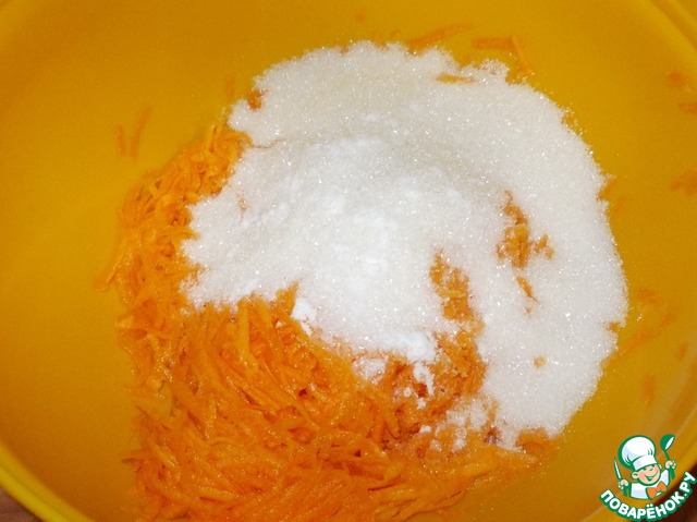 • Начнем с приготовления основы для нашего десерта - это тыквенный корж! В нашей семье эти тыквенные коржи готовятся регулярно и используются не только в этом десерте! Итак, тыкву трем на крупную терку, засыпаем ее сахаром, солью и ванилином перемешиваем и оставляем минут на 20, чтоб хорошо пустила сок! Важно дать время тыкве для выделения сока! Иначе корж может выйти клеклым и не пропеченным!