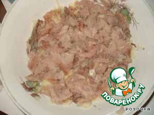 • Сельдь (у меня самодельная) разобрать, порезать мелкими кусочками и выложить на картофель.