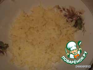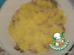 • Сверху выкладываем натертый на крупной терке плавленый сырок.