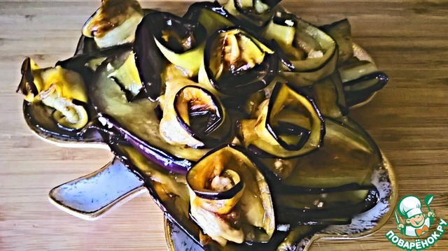 Аккуратно стряхиваем излишки соуса и укладываем баклажаны рядами на тарелку, к которой будете подавать. Если вы готовите сразу большое количество, то уложить можно в банку или контейнер.