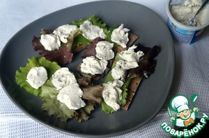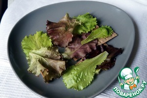 На блюдо выложить листовой салат, сверху поместить закуску.
