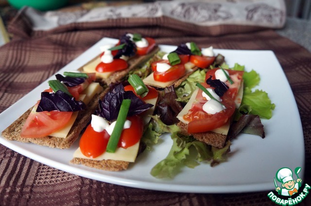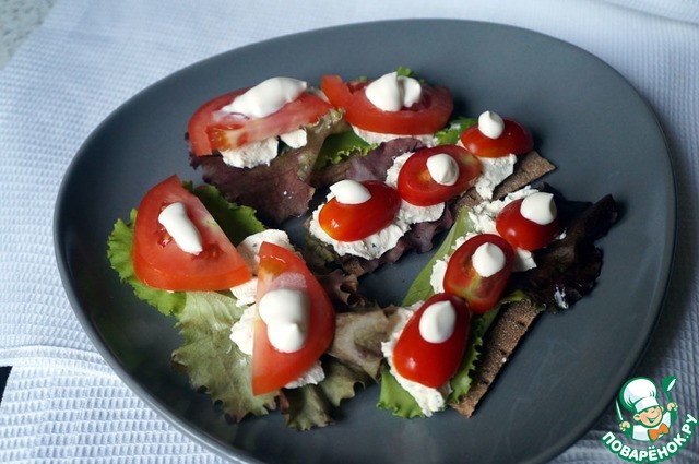 Сыр мааздам порезать тонко, выложить на хлебцы и галеты, на него – тонко нарезанные помидоры. Капнуть по капле майонеза.
