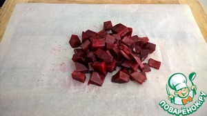 Нарезаем сырую свеклу кубиком 1 см, выкладываем на лист пекарской бумаги и сбрызгиваем оливковым маслом для жарки (Extra Light - потому, что оно будет нагреваться) - чтобы кубики не слипались при запекании. Можно использовать любое рафинированное растительное масло. -