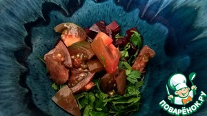Это довольно простой салат, который обладает очень мягким и интересным вкусом. Рецепт этот взят из передачи непревзойденного Ильи Лазерсона - "Завтрак в постель". И действительно он отлично подходит для завтрака - легкий и вместе с тем сытный - за счет присутствия пармской ветчины. В классическом сочетании свеклы и брынзы, которая обладает довольно резким вкусом - брынза заменена творогом, который придает этому салату довольно нежный вкус и не перекрывает вкус прошутто. Сочетание сладковатого вкуса запеченной свеклы с творогом дополняется и подчеркивается кислинкой помидоров и горчинкой оливкового масла. По желанию можно усилить кислый вкус добавлением лимонного сока.