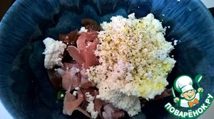 Добавляем творог, оливковое масло (Extra Virgin) и, по желанию, лимонный сок. Перчим, солим и перемешиваем.