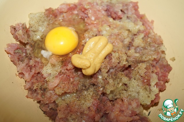 В мясной фарш добавить сырое яйцо и горчицу, хорошо перемешать и дать настояться.