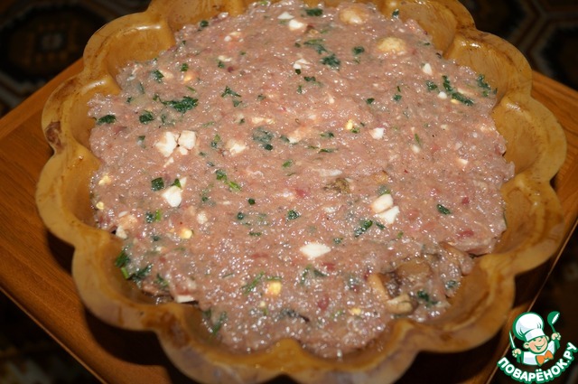 В глубокой миске хорошо вымесить фарш, печень, яйца, грибы, соль, специи и перец с зеленью по вкусу.